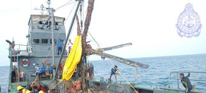 Divers of the Sri Lanka Navy salvaged the debris of a helicopter in the seas 01 nautical mile east of Chalai on 25th May 2014.