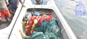 Naval personnel attached to SLNS Gajaba of the Eastern Naval Command on coastal protection duties arrested two persons with 2 kilograms of gelignite (20 sticks), 02 pairs of divine fins, 03 diving masks, 1fishing net and 1 FGD intended to be used in illegal fishing in the seas off Southbar in Mannar on 07th February 2015.